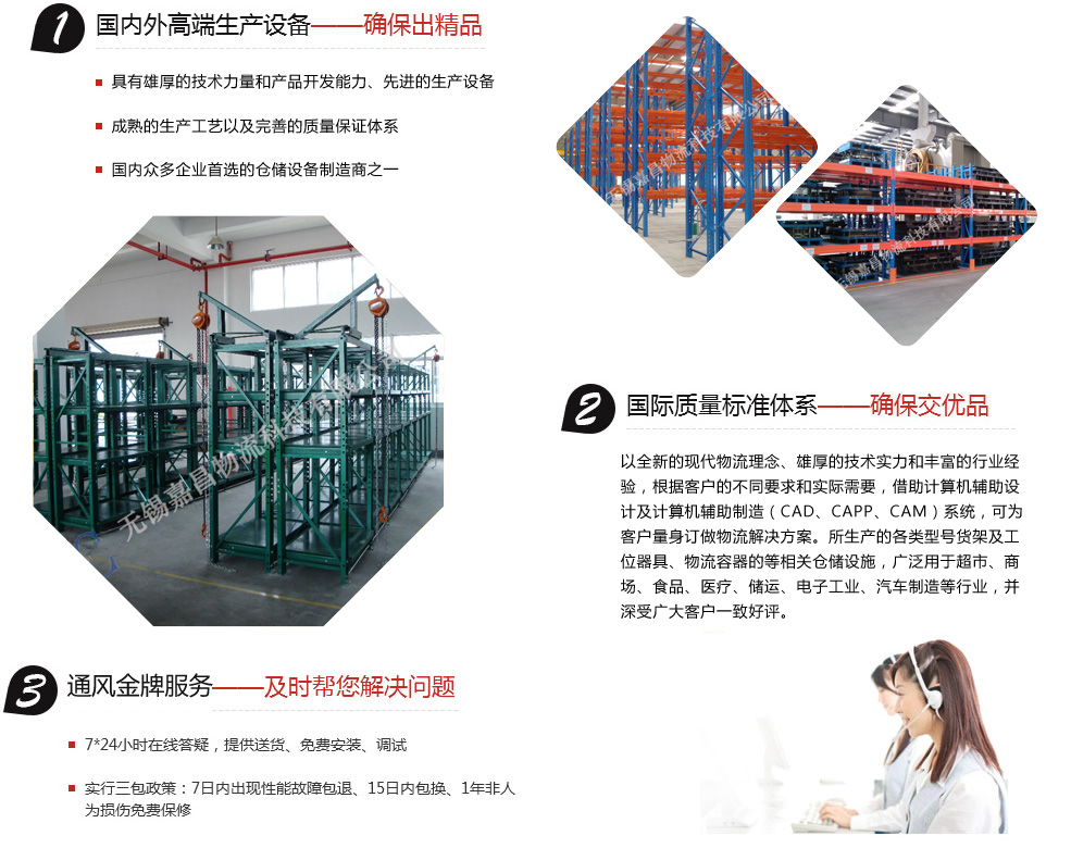無(wú)錫嘉昌倉(cāng)儲(chǔ)貨架有限公司擁有多年的設(shè)計(jì)、生產(chǎn)、管理經(jīng)驗(yàn)。以全新的現(xiàn)代物流理念、雄厚的技術(shù)實(shí)力和豐富的行業(yè)經(jīng)驗(yàn),根據(jù)客戶的不同要求和實(shí)際需要,借助計(jì)算機(jī)輔助設(shè)計(jì)及計(jì)算機(jī)輔助制造(CAD、CAPP、CAM)系統(tǒng),可為客戶量身訂做物流解決方案。所生產(chǎn)的各類型號(hào)貨架及工位器具、物流容器的等相關(guān)倉(cāng)儲(chǔ)設(shè)施,廣泛用于超市、商場(chǎng)、食品、醫(yī)療、儲(chǔ)運(yùn)、電子工業(yè)、汽車制造等行業(yè),并深受廣大客戶一致好評(píng)。